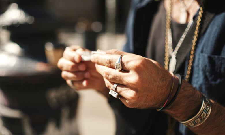 Close-up of male hands in bracelets and rings rolls cigarette. Male hands wrapping tobacco in tissue paper